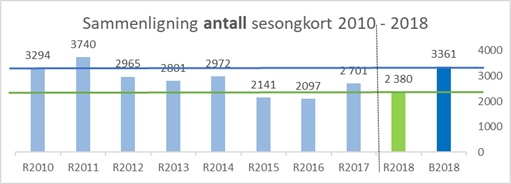Den grønne søylen viser antall sesongkort som faktisk er solgt til nå, og dette tallet er allerede høyere enn totalsalget for 2015 og 2016. Per i dag ligger vi 10% foran salgstallet på tilsvarende tidspunkt i fjor. Den mørkeblå søylen viser det antallet sesongkort man har budsjettert med å selge, og selv om dette er et høyt tall, høyere enn alle andre år enn 2011 siden 2010, så mener Nydal at det er realistisk å nå dette målet.