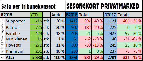 Hvis vi bryter ned tallene til de ulike tribunene, så ser vi at det er supportertribunen som per i dag ligger lengst unna salgsbudsjettet.